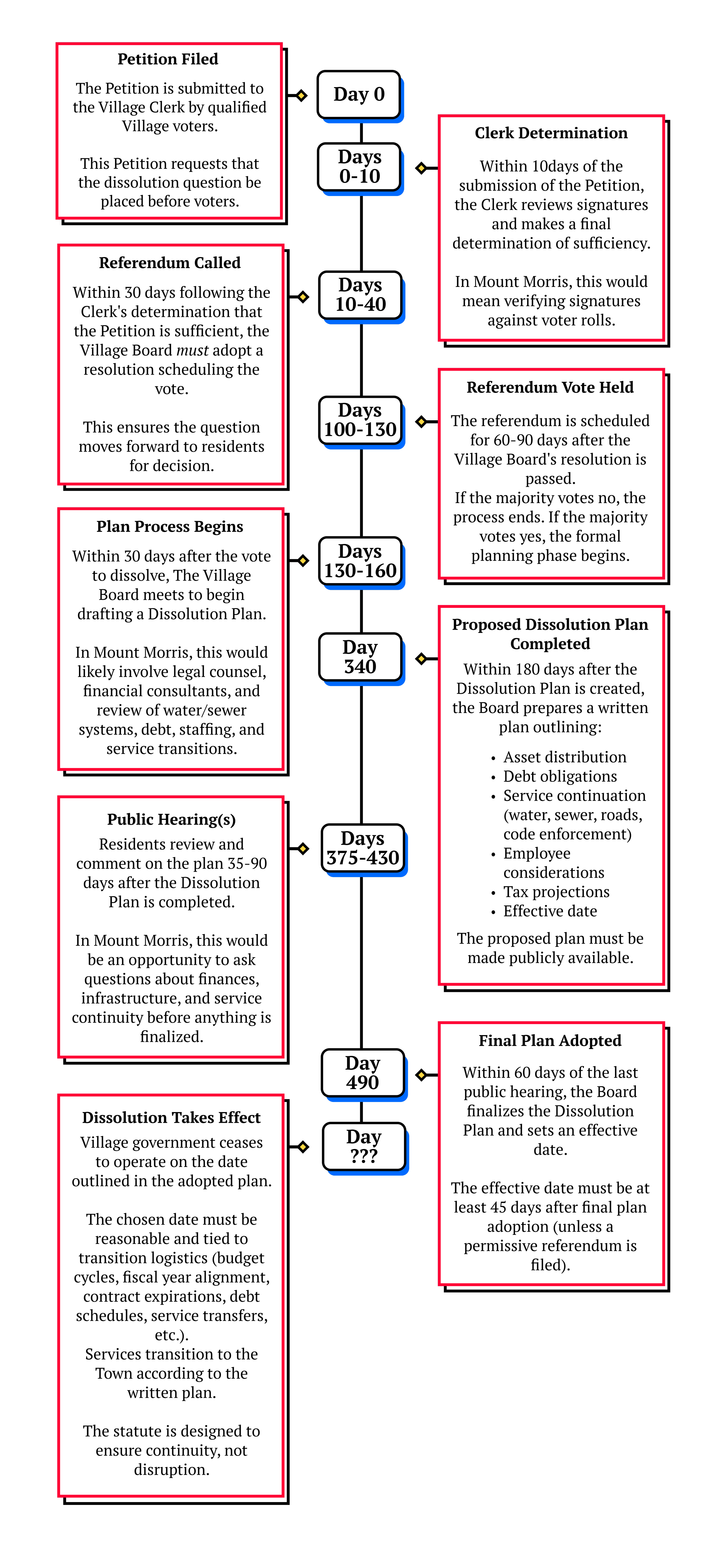 This page outlines the full statutory process under New York General Municipal Law Article 17-A and explains what each step would look like specifically in Mount Morris. The timeline below is designed to provide clarity— not advocacy— so residents can understand the structure, safeguards, and realistic timeframes involved.