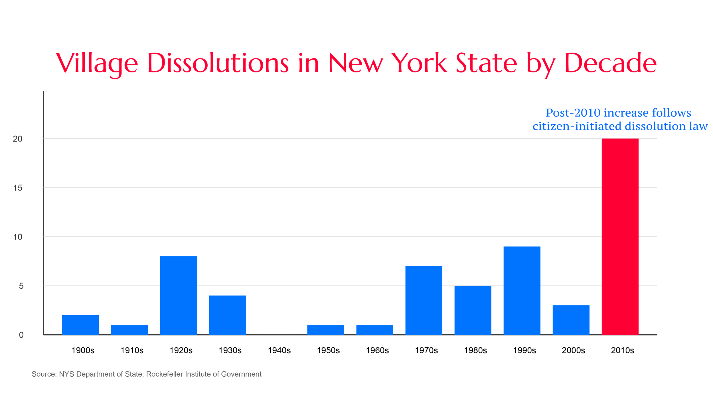 After the 2010 adoption of the Government Reorganization and Citizen Empowerment Act in New York, there was a noticeable uptick in village dissolution efforts—not because the state encouraged villages to disappear, but because it finally made it practical for communities to vote on the question themselves. Before the law, dissolution was legally possible but procedurally difficult, expensive, and dependent on village boards initiating a process that could eliminate their own positions. The 2010 law removed those barriers by giving residents a direct, voter-driven pathway, standardizing timelines, and pairing local choice with state planning support. As a result, more villages began conducting formal studies, holding referenda, and openly debating whether their existing structure still made sense. Some ultimately dissolved, others voted no, but across the state, the conversation itself became more common and more transparent. The increase reflected greater access and empowerment: communities were finally able to ask the question, review real data, and decide for themselves whether dissolution was the right fit.